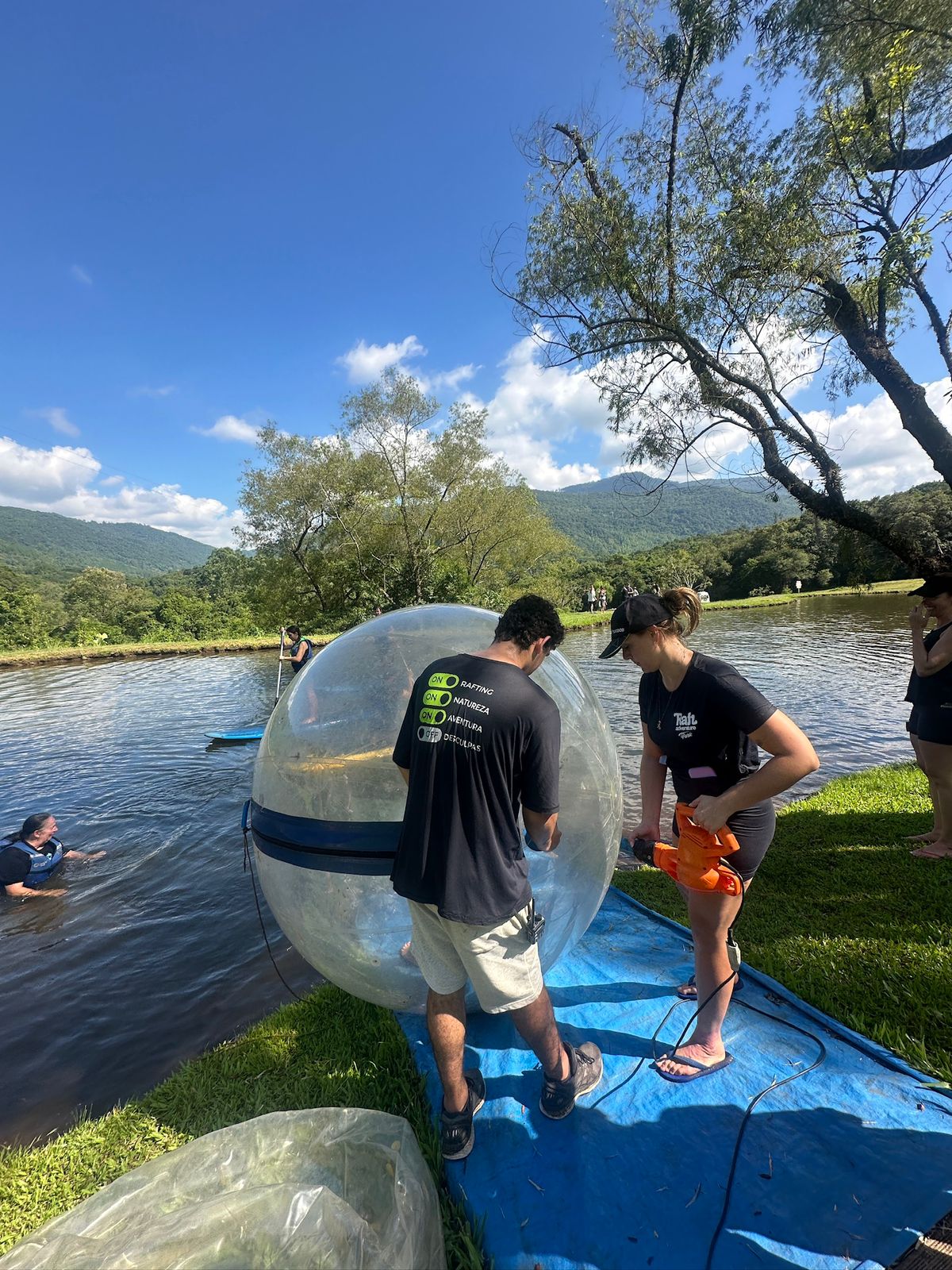 Dentro de uma grande bolha de plástico, o desafio é ficar de pé. Venha flutuar sobre o Lago!