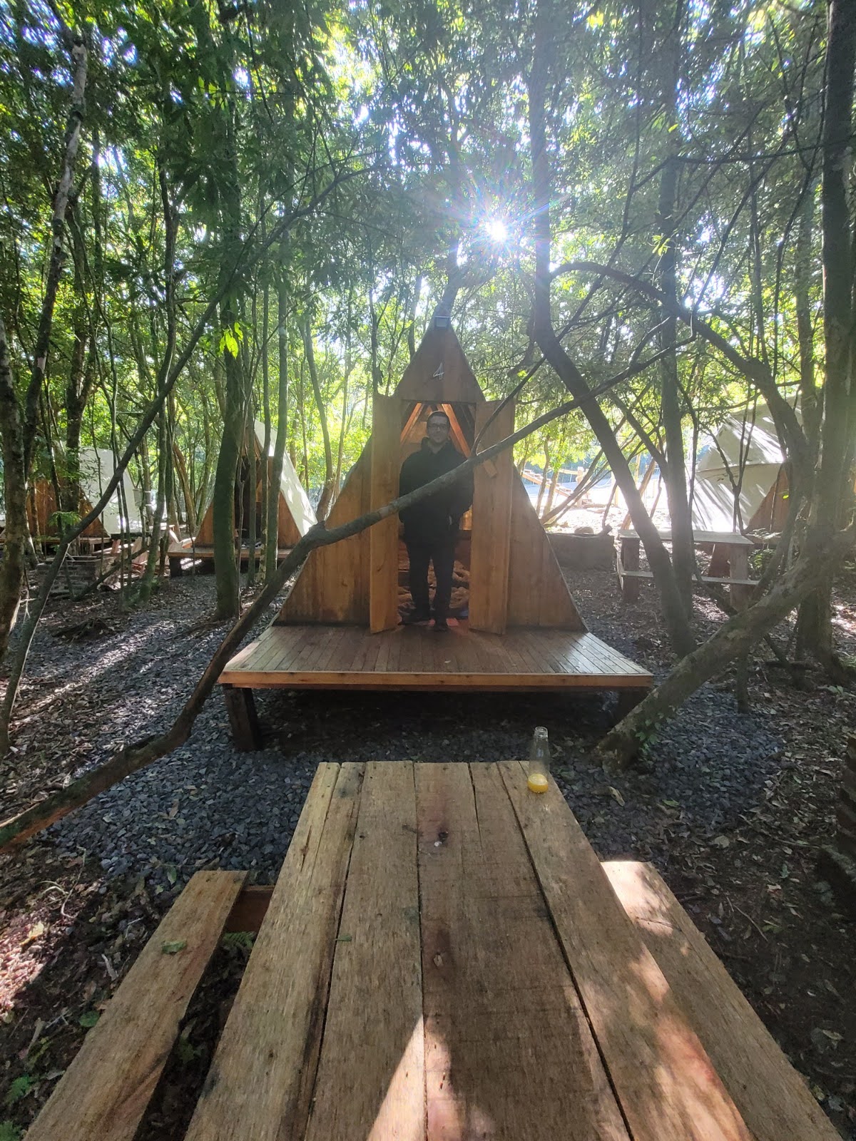 Uma opção de hospedagem em cabanas de madeira em formato de barraca, com boa estrutura, em meio ao bosque, próximo do rio e da trilha.
